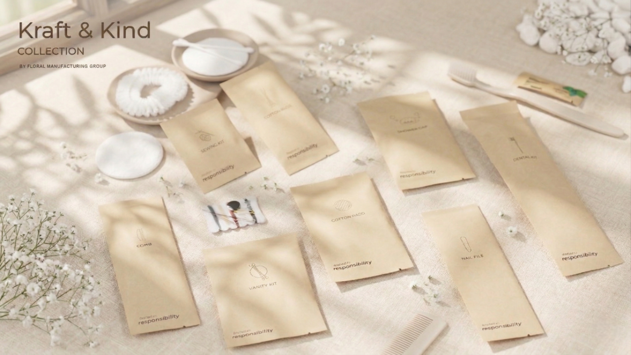 Kraft & Kind COLLECTION คือชุดสิ่งอำนวยความสะดวกในโรงแรมที่เน้นความยั่งยืนภายใต้แนวคิด “หยั่งรากในความรับผิดชอบ” โดดเด่นด้วยบรรจุภัณฑ์กระดาษคราฟท์สีอบอุ่นและดีไซน์มินิมอล ช่วยลดการใช้พลาสติกและเป็นมิตรต่อสิ่งแวดล้อมอย่างแท้จริง ครบครันด้วยของใช้จำเป็นคุณภาพสูง ทั้งชุดแปรงฟัน หวี ชุดเย็บผ้า และอุปกรณ์ดูแลผิวที่จัดวางอย่างสวยงามเป็นธรรมชาติ ช่วยยกระดับภาพลักษณ์ของโรงแรมให้ดูทันสมัย ใส่ใจโลก และสร้างความประทับใจที่แตกต่างให้แก่แขกผู้เข้าพัก ผลงานคุณภาพโดย Floral Manufacturing Group ที่เปลี่ยนการบริการในห้องพักให้เป็นการดูแลโลกไปพร้อมกัน