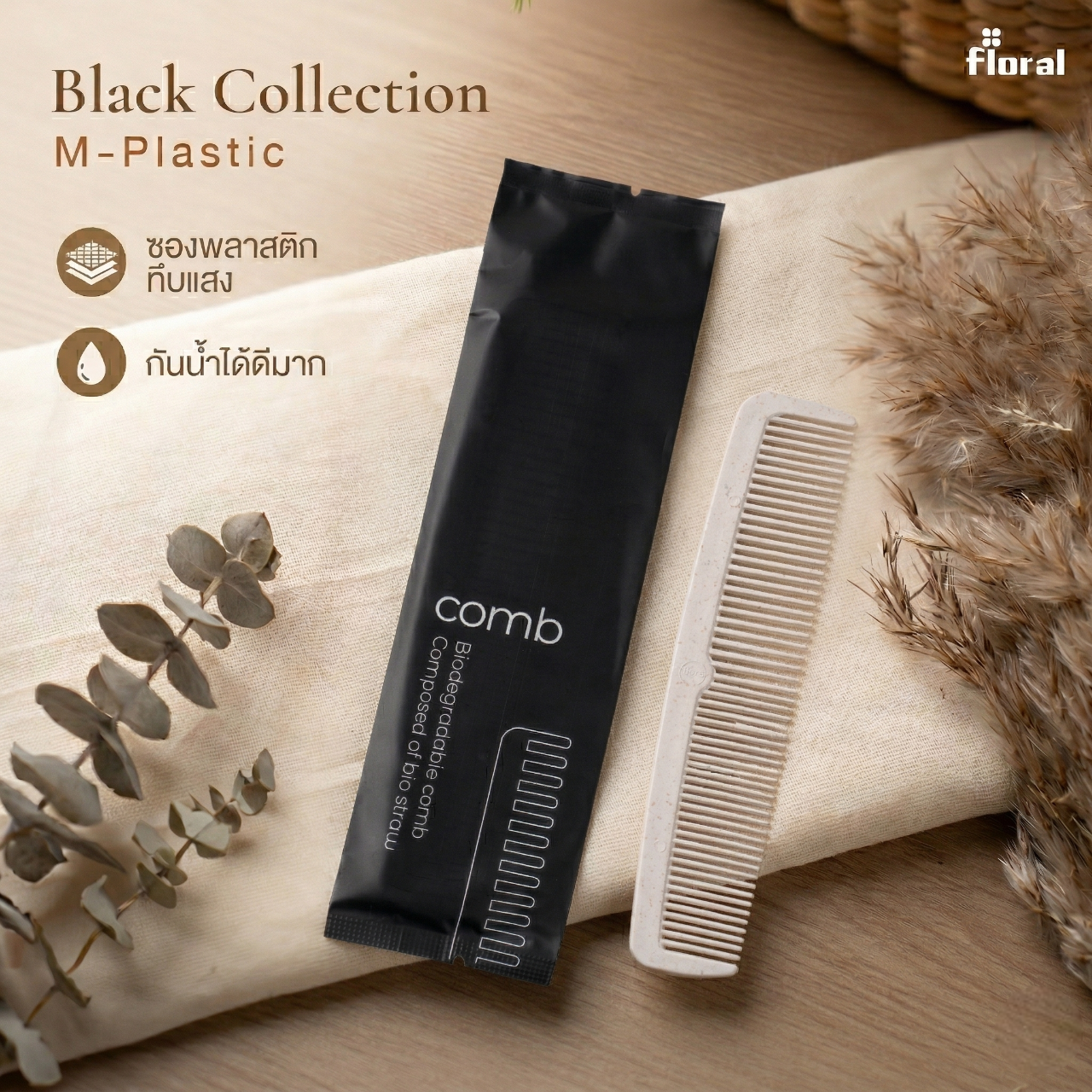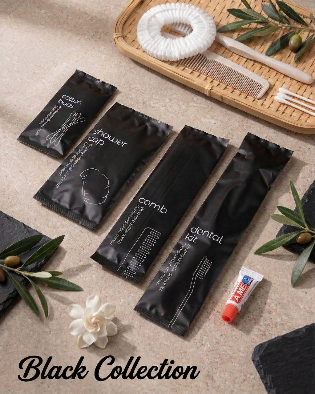 ชุดของใช้ “Black Collection” รวม 4 ไอเทมจำเป็น (แปรงสีฟัน, คัตตอนบัด, หมวกคลุมผม, หวี) ในราคาประหยัดที่สุด โดดเด่นด้วยซองพลาสติกสีดำทึบแสง (M-Plastic) ดีไซน์เรียบหรูทันสมัย พร้อมคุณสมบัติกันน้ำได้ดีเยี่ยม ช่วยยกระดับภาพลักษณ์ที่พักให้ดูพรีเมียมในงบประมาณที่คุ้มค่า เหมาะสำหรับโรงแรมและรีสอร์ตยุคใหม่ มอบความสะดวกสบายและสร้างความประทับใจให้แขกผู้เข้าพัก ด้วยรายละเอียดที่ใส่ใจในคุณภาพอย่างลงตัว