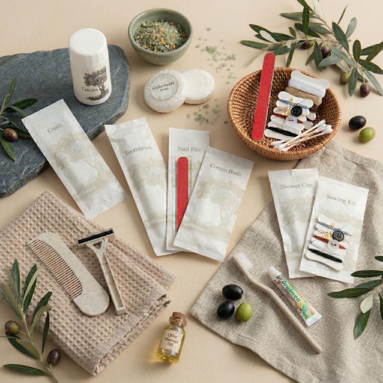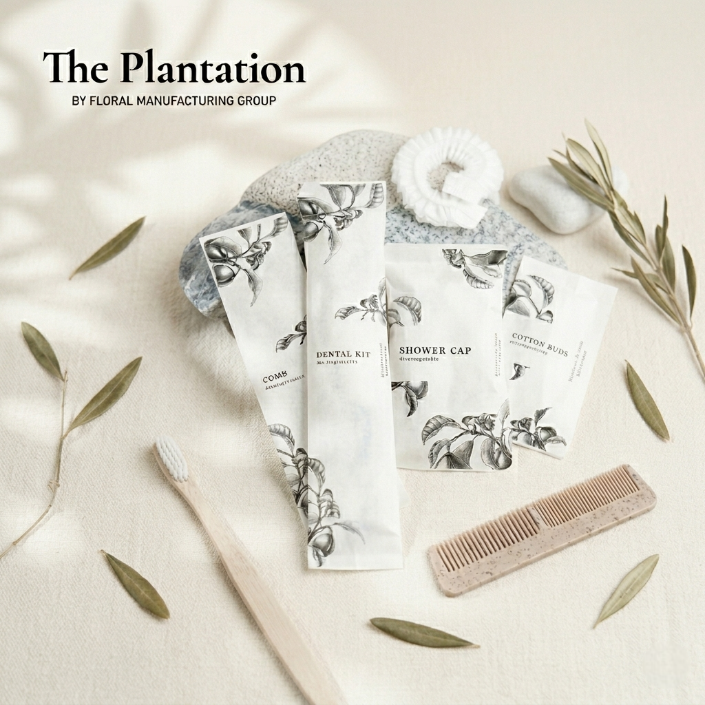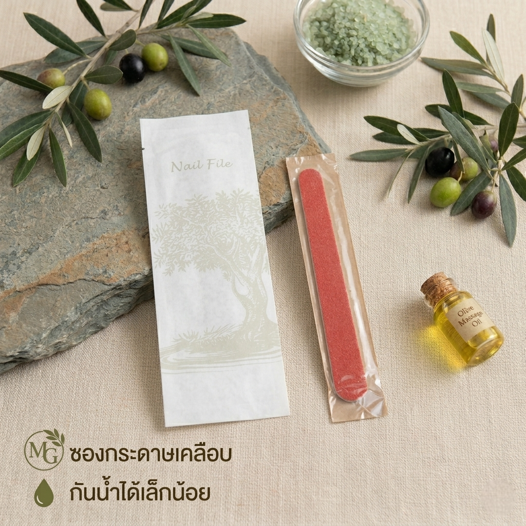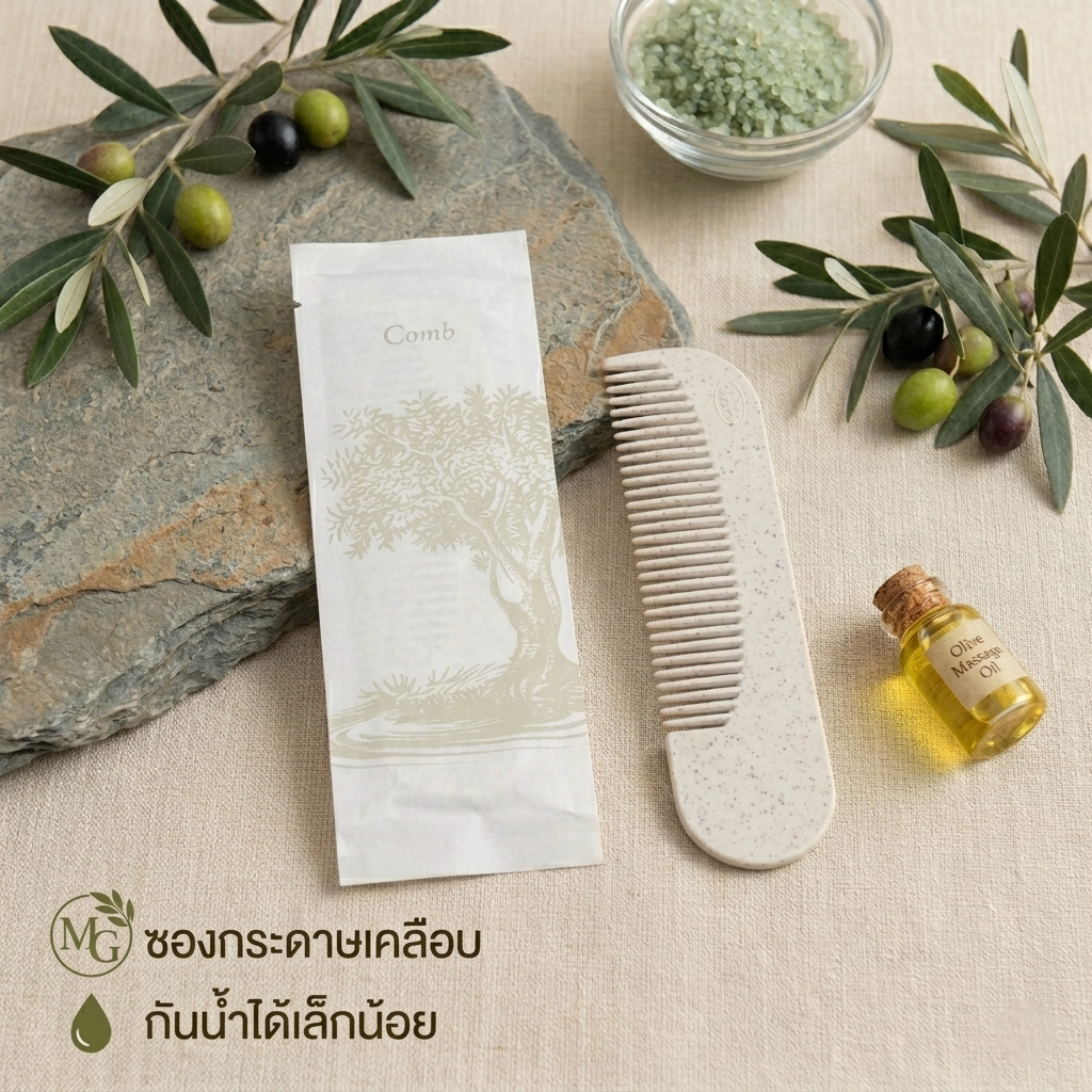 ชุดของใช้ในห้องน้ำโรงแรม 9 ไอเทม ดีไซน์มินิมอลลายต้นมะกอก เรียบหรูดูแพง ชูจุดเด่นด้วยบรรจุภัณฑ์ “ซองกระดาษเคลือบ กันน้ำได้เล็กน้อย” ช่วยลดพลาสติกและรักษ์โลกอย่างยั่งยืน ครบครันทั้งชุดแปรงสีฟัน มีดโกน หวี สบู่ และอุปกรณ์จำเป็นพื้นฐาน บรรจุแยกซองสะอาดและหยิบใช้ง่าย ยกระดับภาพลักษณ์ที่พักด้วยแนวคิด Eco-Friendly Luxury มอบประสบการณ์การพักผ่อนที่ใส่ใจสิ่งแวดล้อม