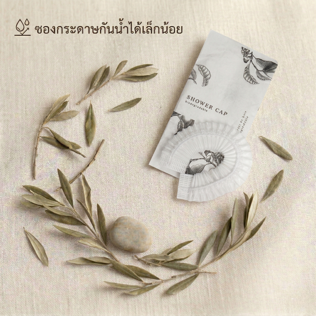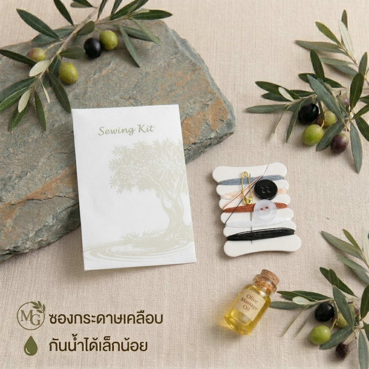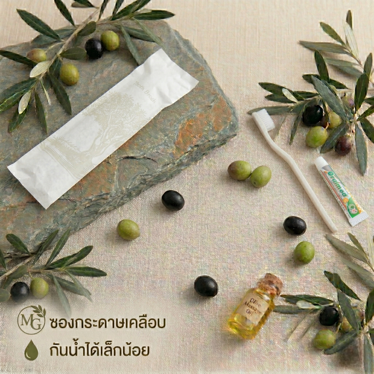 ชุดของใช้ในห้องน้ำโรงแรม 9 ไอเทม ดีไซน์มินิมอลลายต้นมะกอก เรียบหรูดูแพง ชูจุดเด่นด้วยบรรจุภัณฑ์ “ซองกระดาษเคลือบ กันน้ำได้เล็กน้อย” ช่วยลดพลาสติกและรักษ์โลกอย่างยั่งยืน ครบครันทั้งชุดแปรงสีฟัน มีดโกน หวี สบู่ และอุปกรณ์จำเป็นพื้นฐาน บรรจุแยกซองสะอาดและหยิบใช้ง่าย ยกระดับภาพลักษณ์ที่พักด้วยแนวคิด Eco-Friendly Luxury มอบประสบการณ์การพักผ่อนที่ใส่ใจสิ่งแวดล้อม