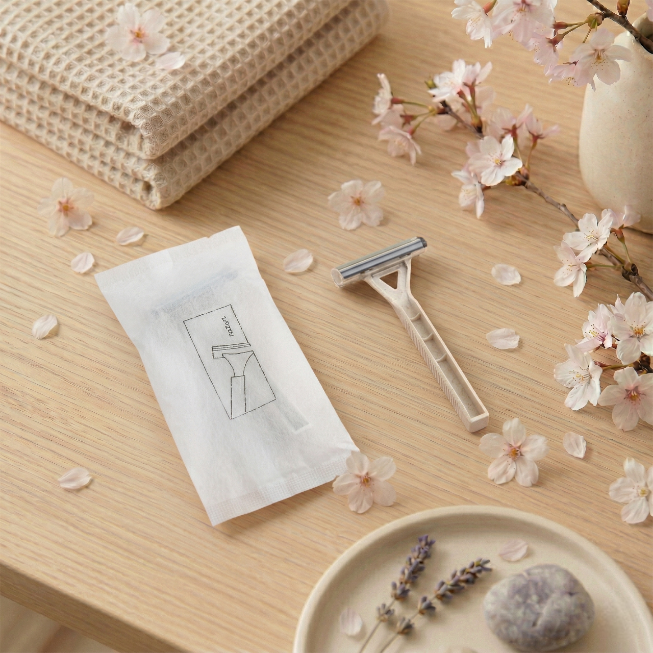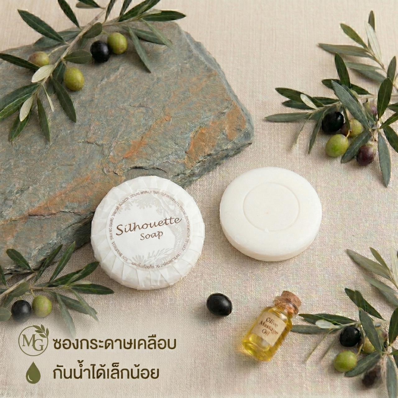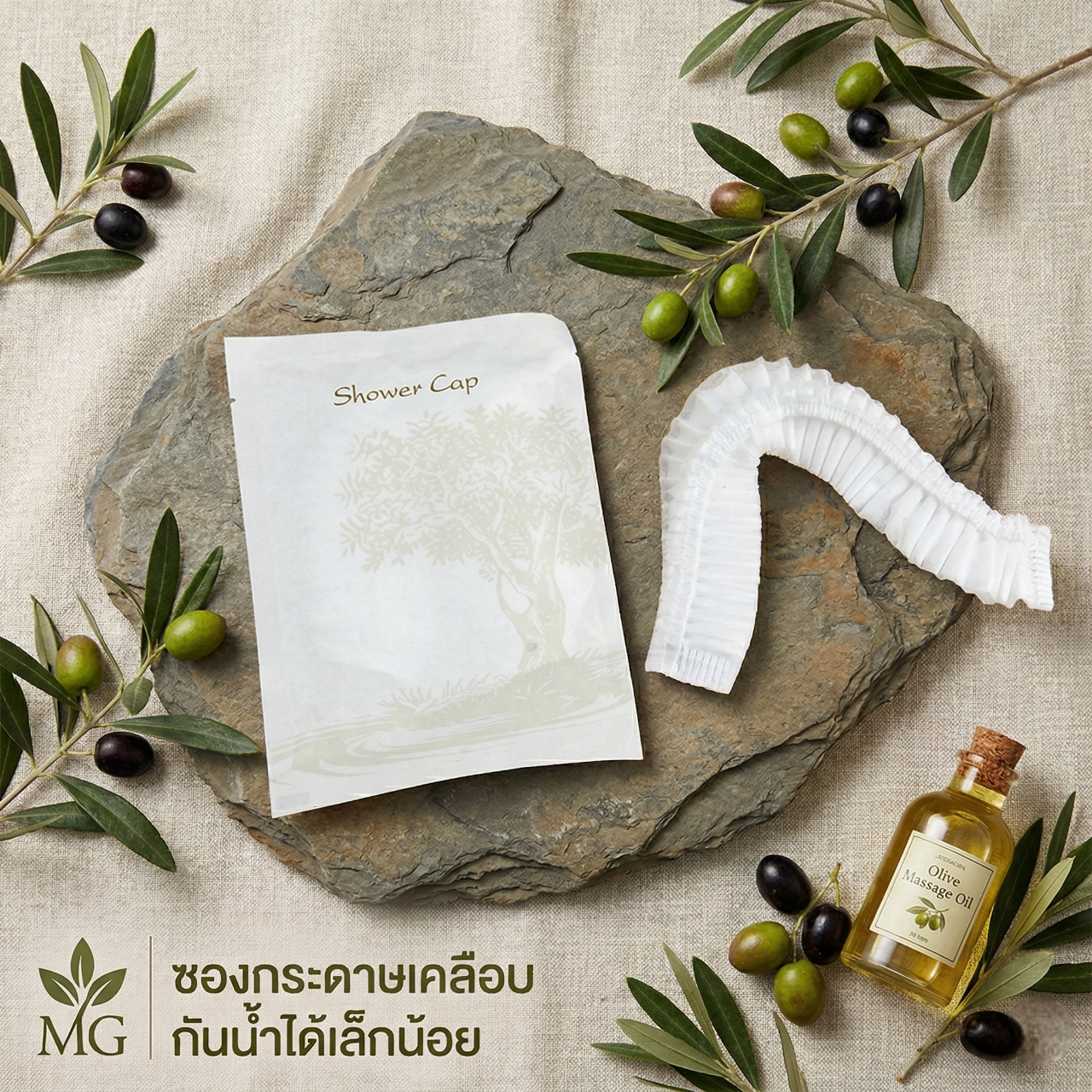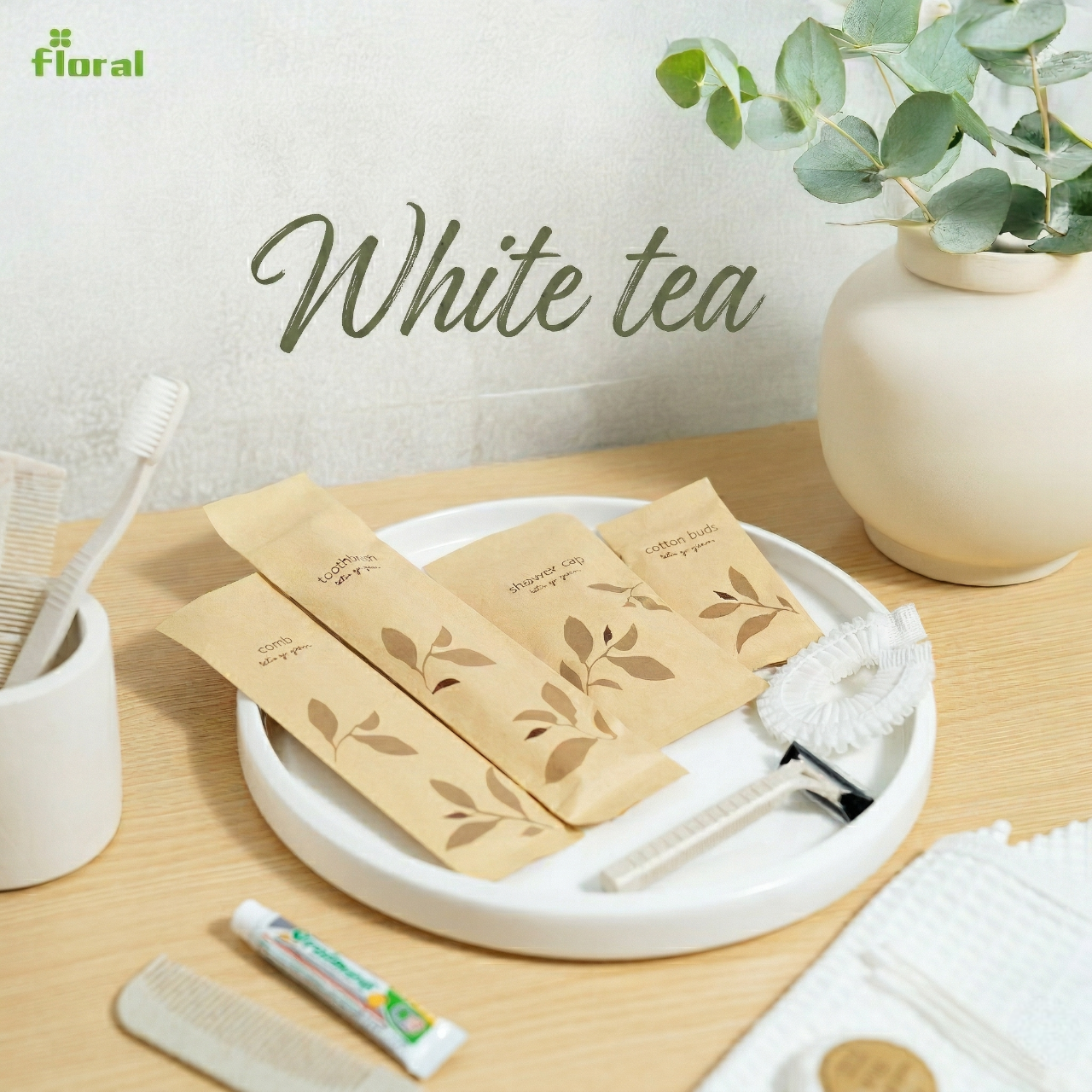 ชุดของใช้ในห้องน้ำโรงแรม 9 ไอเทม ดีไซน์มินิมอลลายต้นมะกอก เรียบหรูดูแพง ชูจุดเด่นด้วยบรรจุภัณฑ์ “ซองกระดาษเคลือบ กันน้ำได้เล็กน้อย” ช่วยลดพลาสติกและรักษ์โลกอย่างยั่งยืน ครบครันทั้งชุดแปรงสีฟัน มีดโกน หวี สบู่ และอุปกรณ์จำเป็นพื้นฐาน บรรจุแยกซองสะอาดและหยิบใช้ง่าย ยกระดับภาพลักษณ์ที่พักด้วยแนวคิด Eco-Friendly Luxury มอบประสบการณ์การพักผ่อนที่ใส่ใจสิ่งแวดล้อม