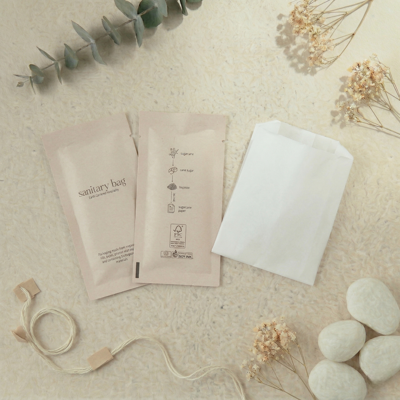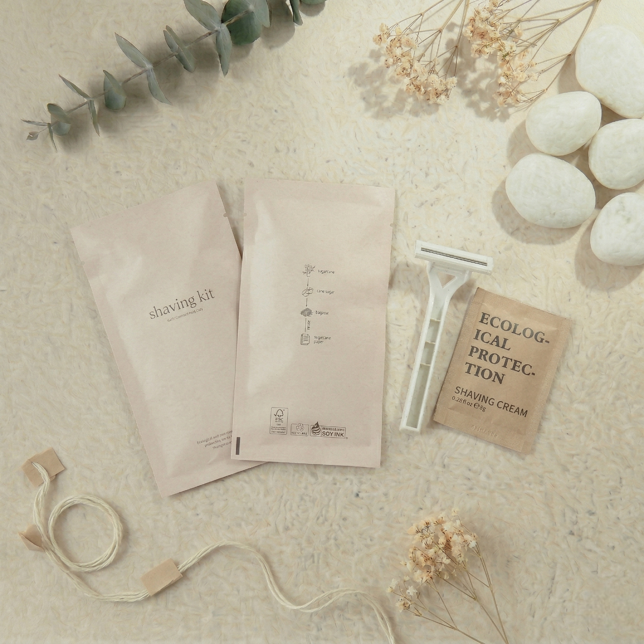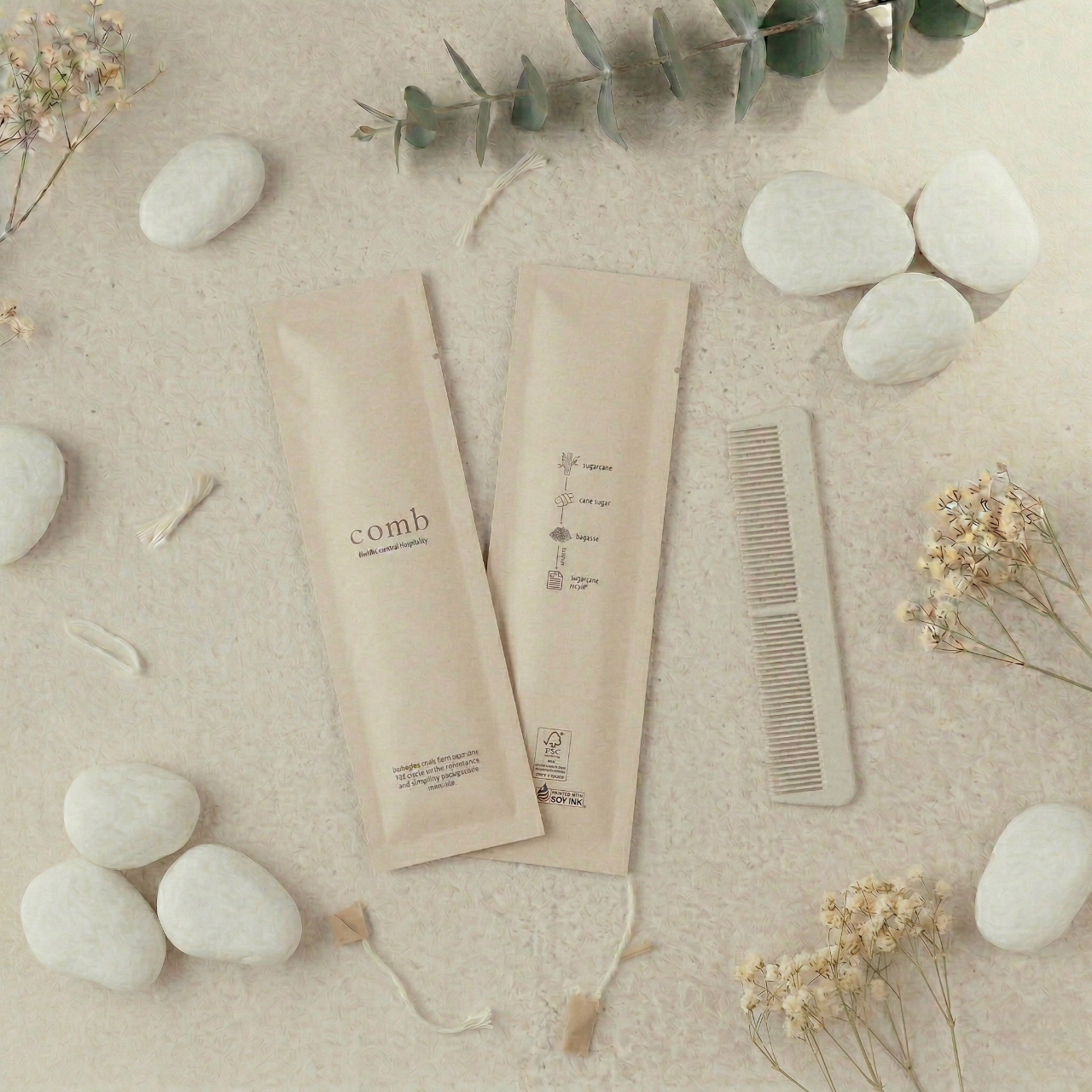 ยกระดับมาตรฐานโรงแรมยุคใหม่ด้วยชุดของใช้ในห้องพักจากใยชานอ้อยที่มุ่งเน้นแนวคิดความยั่งยืนและการดูแลโลกเป็นหัวใจสำคัญ ภายในเซ็ตประกอบด้วยอุปกรณ์ครบครัน ทั้งชุดแปรงสีฟัน ชุดโกนหนวด หวี คัตตอนบัด หมวกคลุมผม และถุงใส่ผ้าอนามัยย่อยสลายได้ บรรจุภัณฑ์ผลิตจากกระดาษชานอ้อยเนื้อสัมผัสธรรมชาติ พิมพ์ด้วยหมึกถั่วเหลืองและใช้กระดาษมาตรฐาน FSC ที่เป็นมิตรต่อสิ่งแวดล้อม ดีไซน์มินิมอลโทนสีครีมสะอาดตาช่วยสร้างบรรยากาศที่ผ่อนคลายและสะท้อนถึงภาพลักษณ์ความพรีเมียมที่ใส่ใจในทุกรายละเอียดของแขก นี่คือทางเลือกที่สมบูรณ์แบบสำหรับการเปลี่ยนทุกการเข้าพักให้เป็นประสบการณ์รักษ์โลกที่น่าประทับใจและช่วยลดปริมาณขยะพลาสติกอย่างแท้จริง