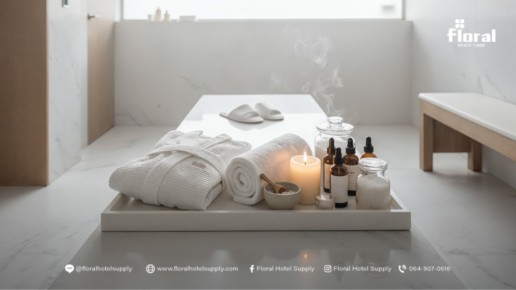 ชุดนี้ควรรวมผ้าคลุมอาบน้ำ (Bathrobe) ผ้าเช็ดตัว และรองเท้าสปาที่ทำจากวัสดุคุณภาพดี ให้ความรู้สึกหรูหราและนุ่มสบาย เพื่อยกระดับประสบการณ์ของแขก