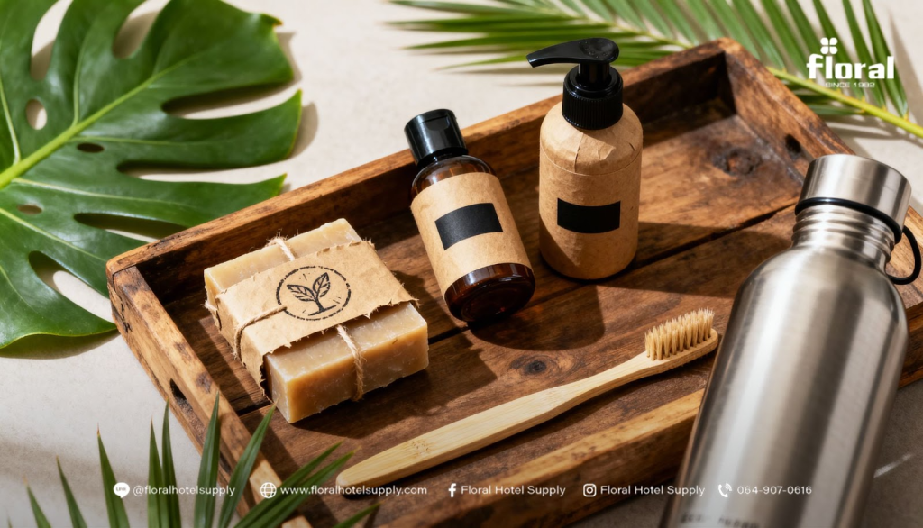 Floral Hotel Supply ให้บริการ eco-friendly amenities OEM พร้อมออกแบบชุด amenities แบรนด์ตัวเอง และจัด wholesale hotel amenities ครบเซ็ต ให้โรงแรมสามารถสร้างแบรนด์ยั่งยืนได้ทันที